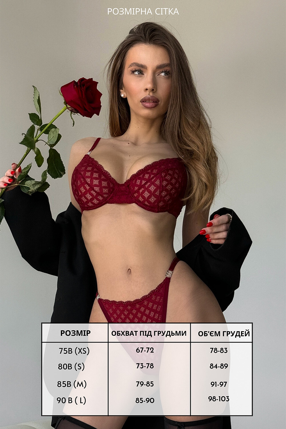 - Luxurious lingerie set in trendy burgundy color with underwire bra and thong.