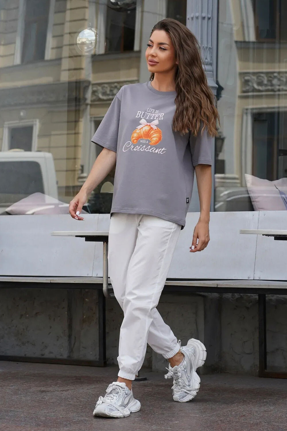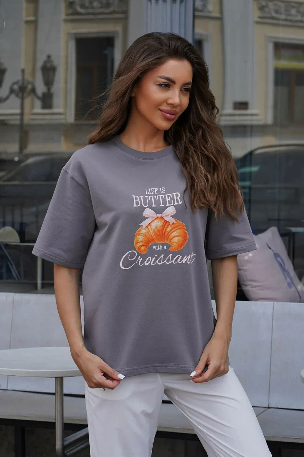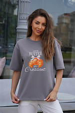 Damen Oversize T-Shirt mit Print Croissant Basic Damen Baumwoll T-Shirts Grau Teamv 8034446