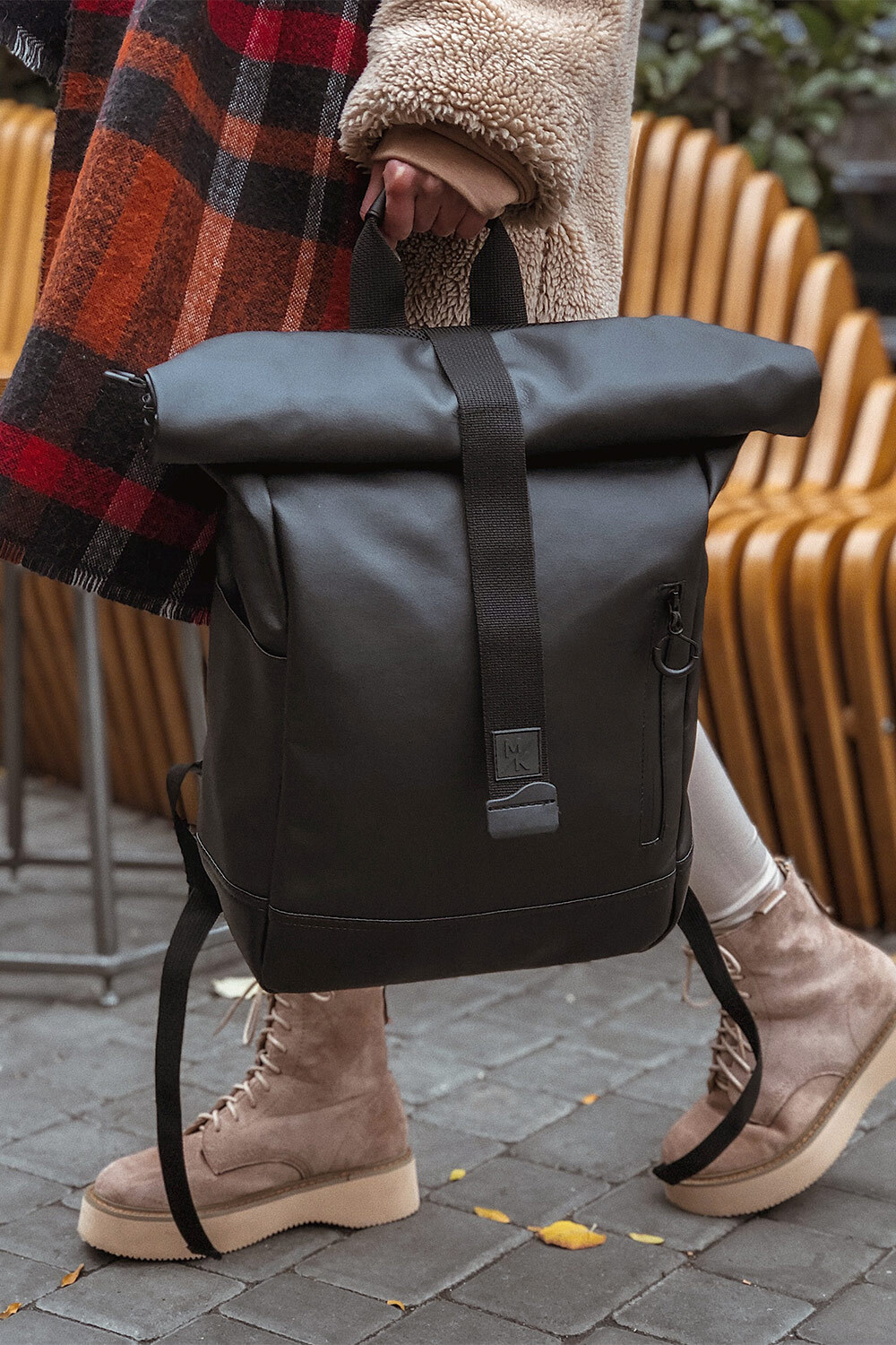 Das Hauptfach dreht und schließt mit Klettverschluss.