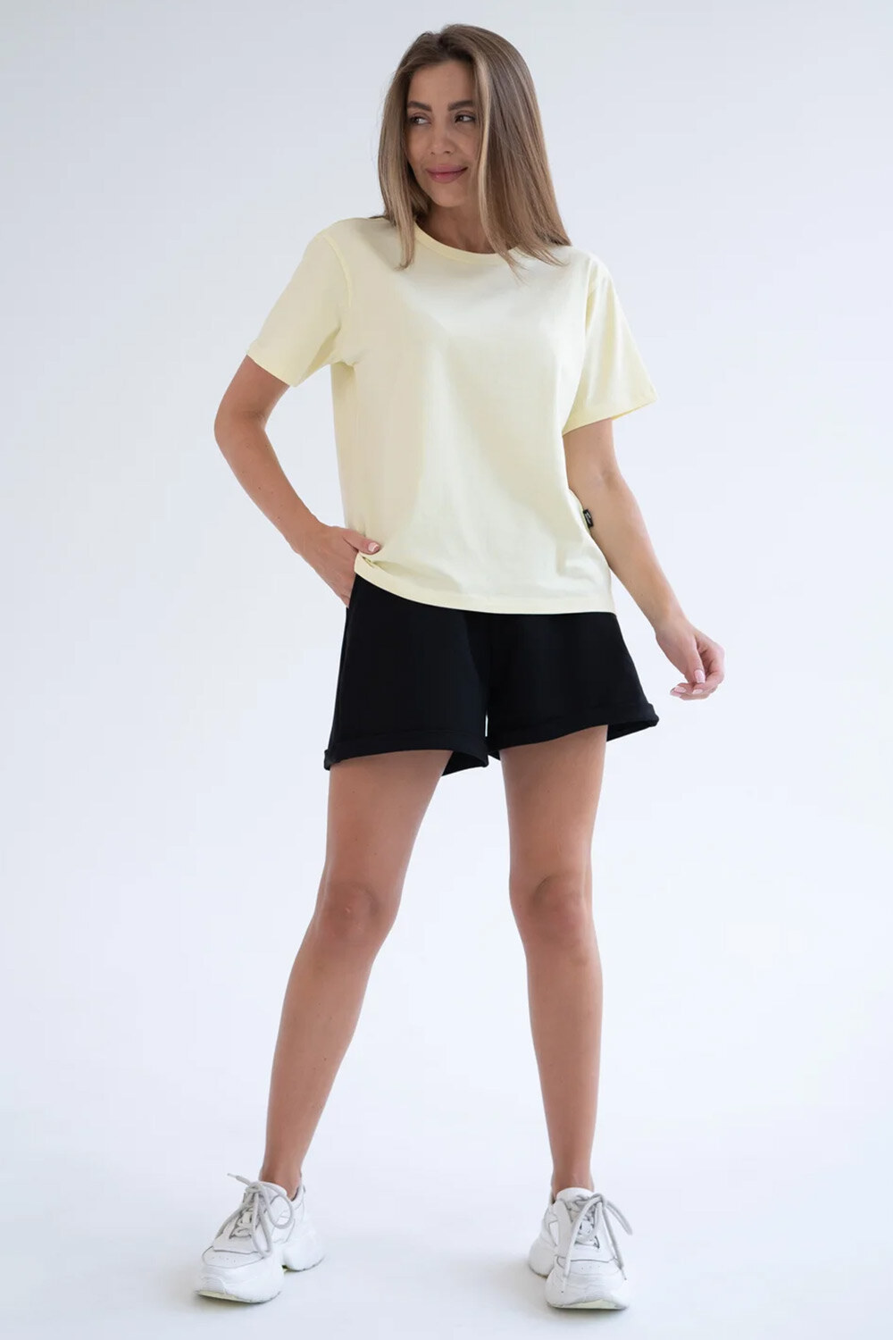 - Basic solid-colored women's t-shirt made from thin Turkish fabric.