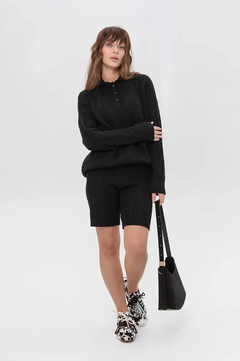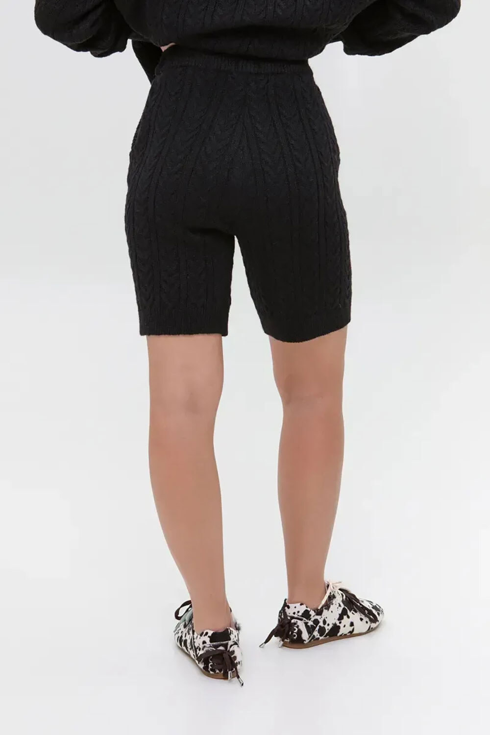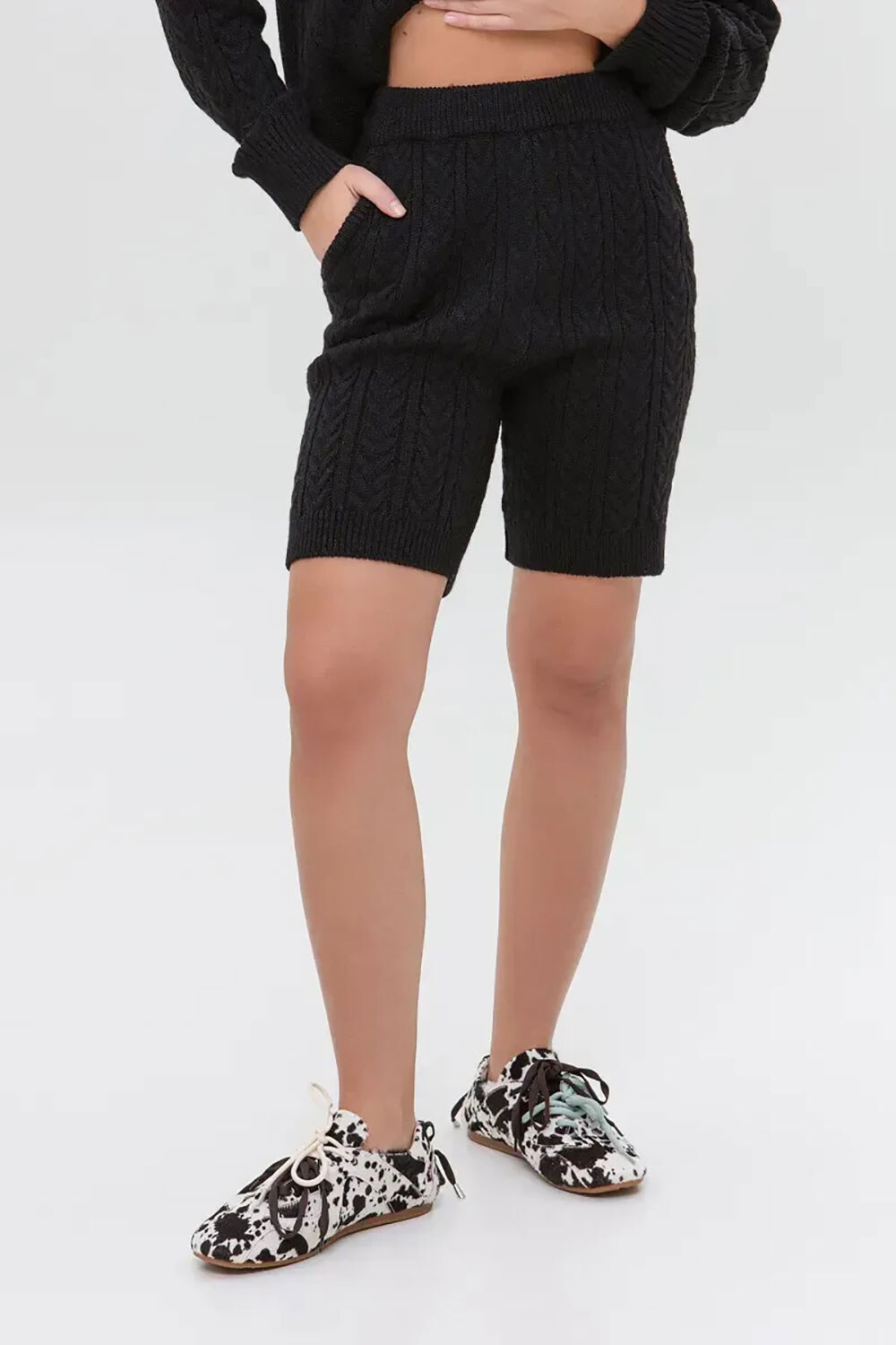 - The unique accent of this style is the voluminous cable knitting that adorns the entire length of the shorts, creating a textured, elegant look.
