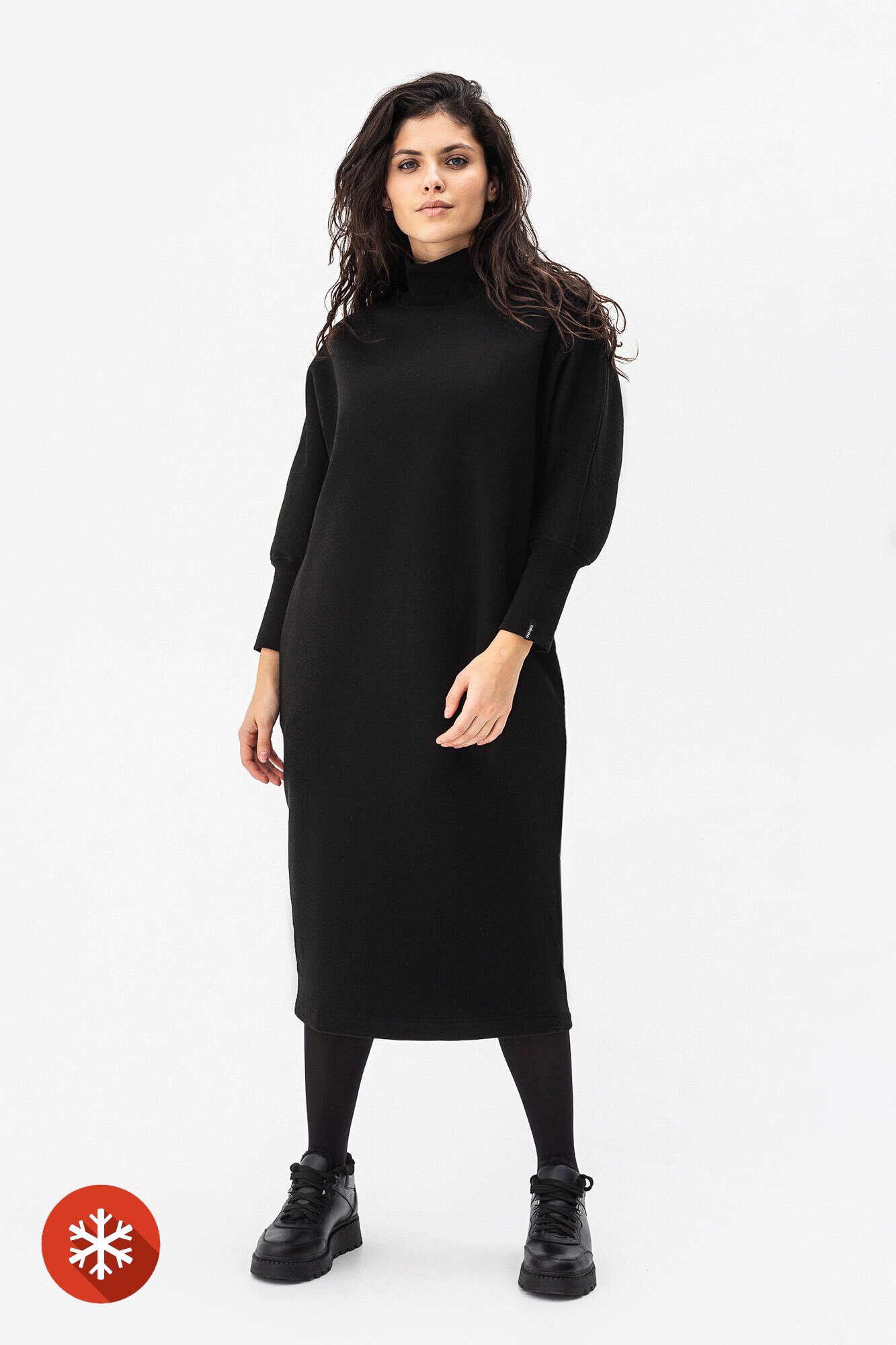 - Сукня жіноча, вільного силуету, злегка завужена до низу, довжиною до середини голені, покрою цільновикроєний рукав.