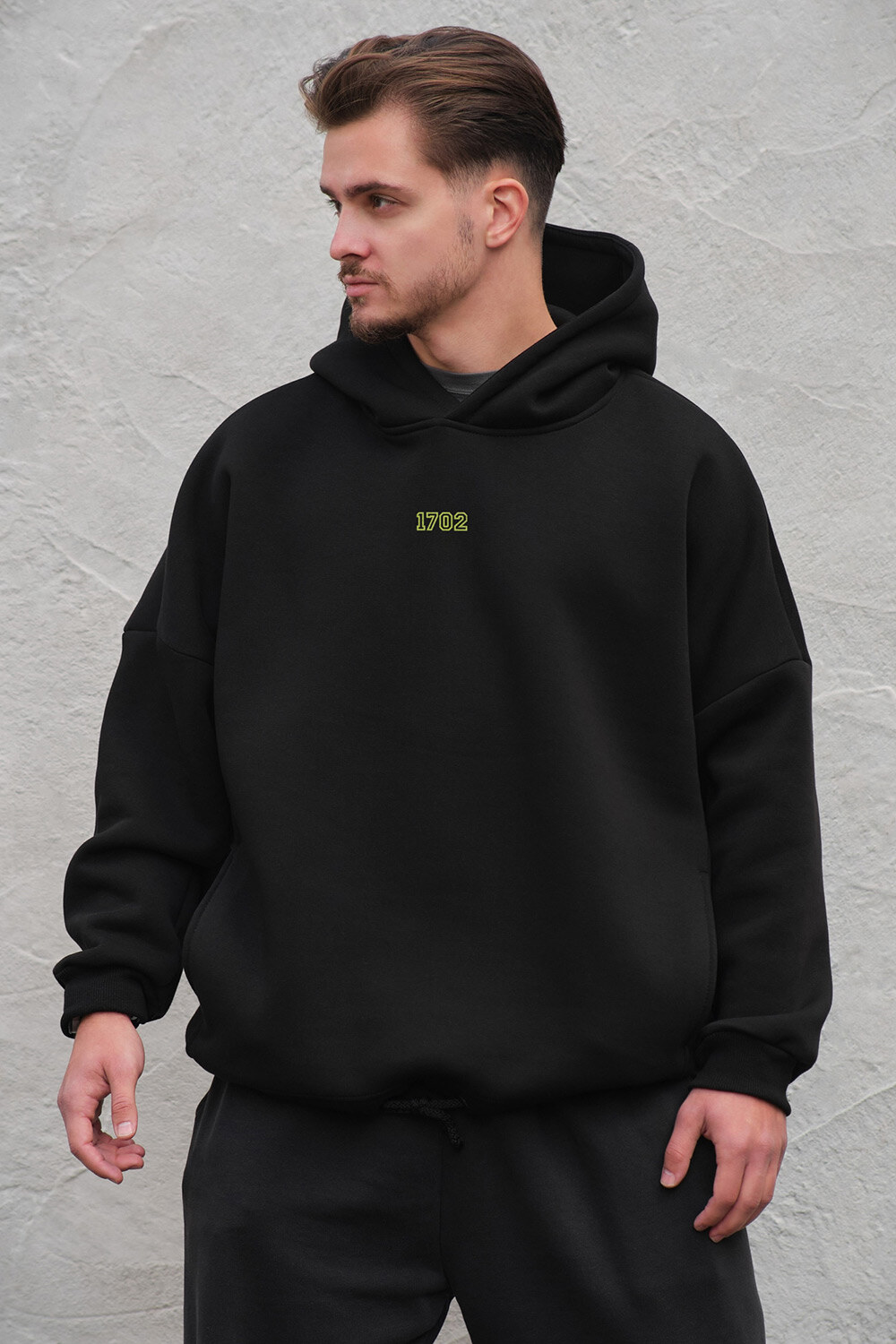 - Schwarzer, übergroßer Kapuzenpullover mit hellem Aufdruck ist eine stilvolle und bequeme Lösung für einen Alltagslook.