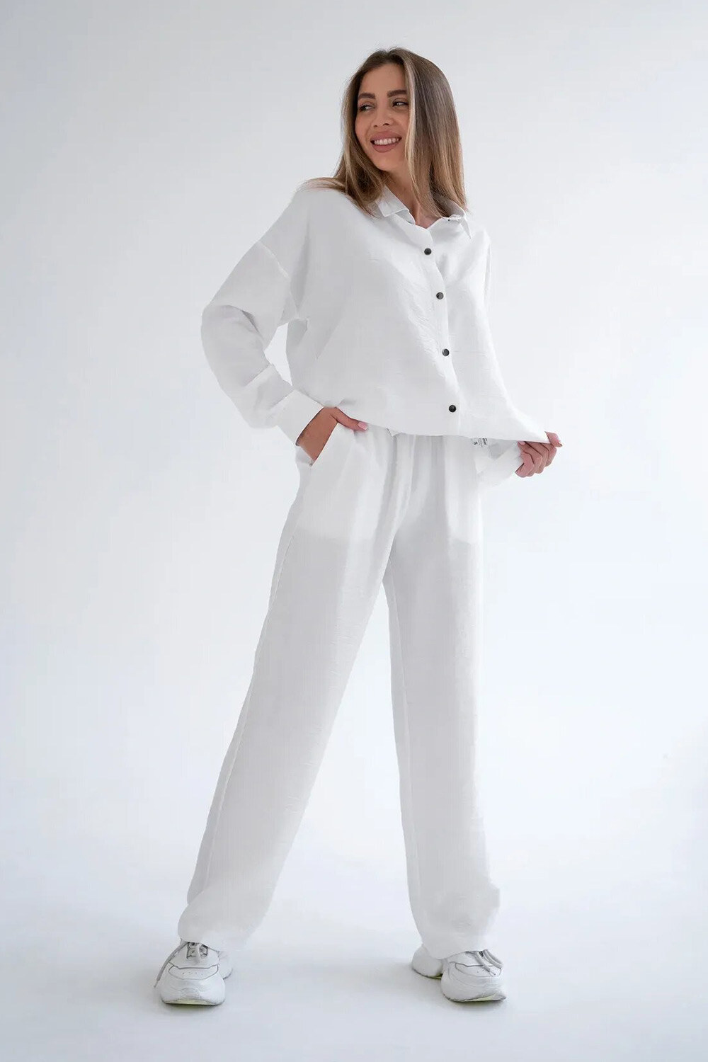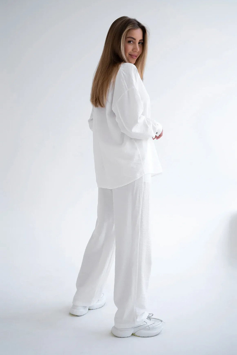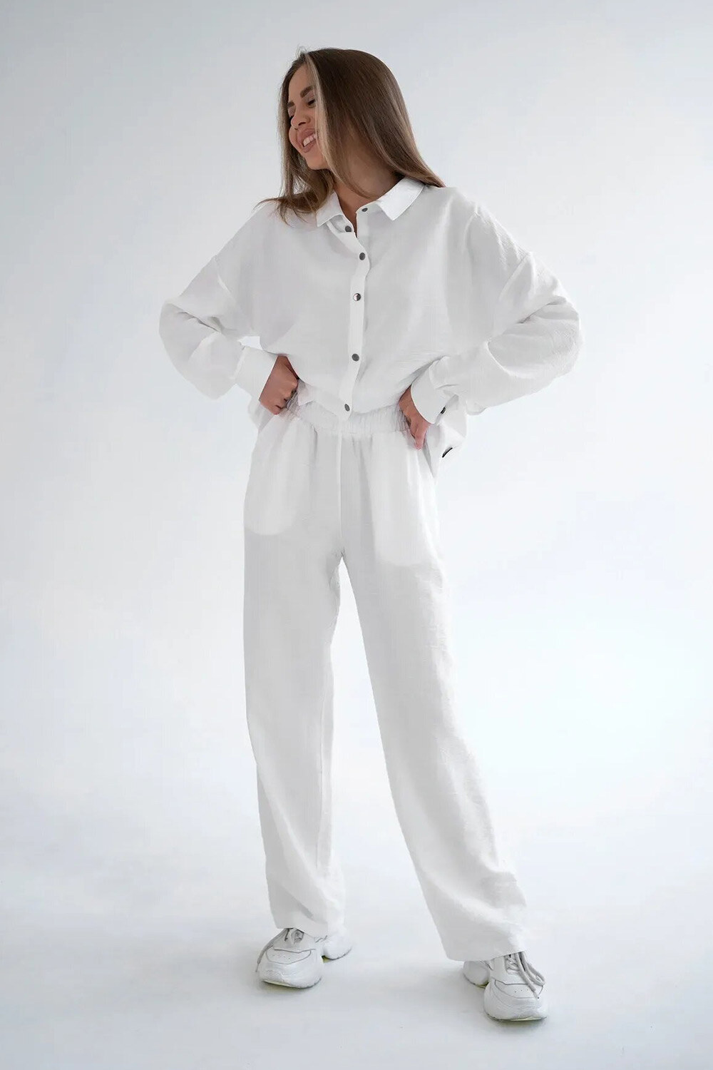 • Жіночий літній костюм із сорочкою вільного крою та штанами на високій посадці.