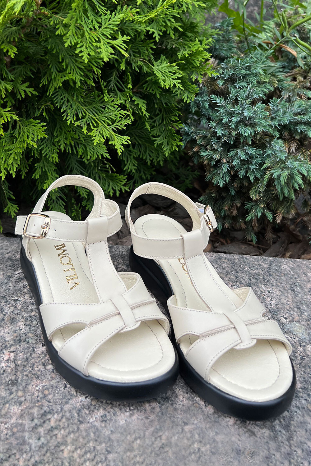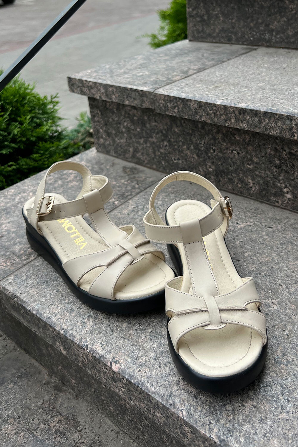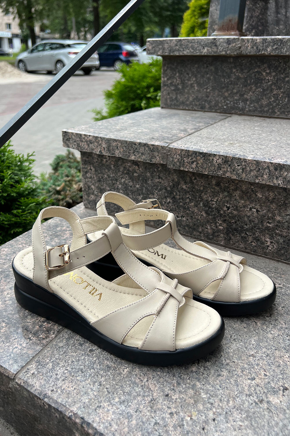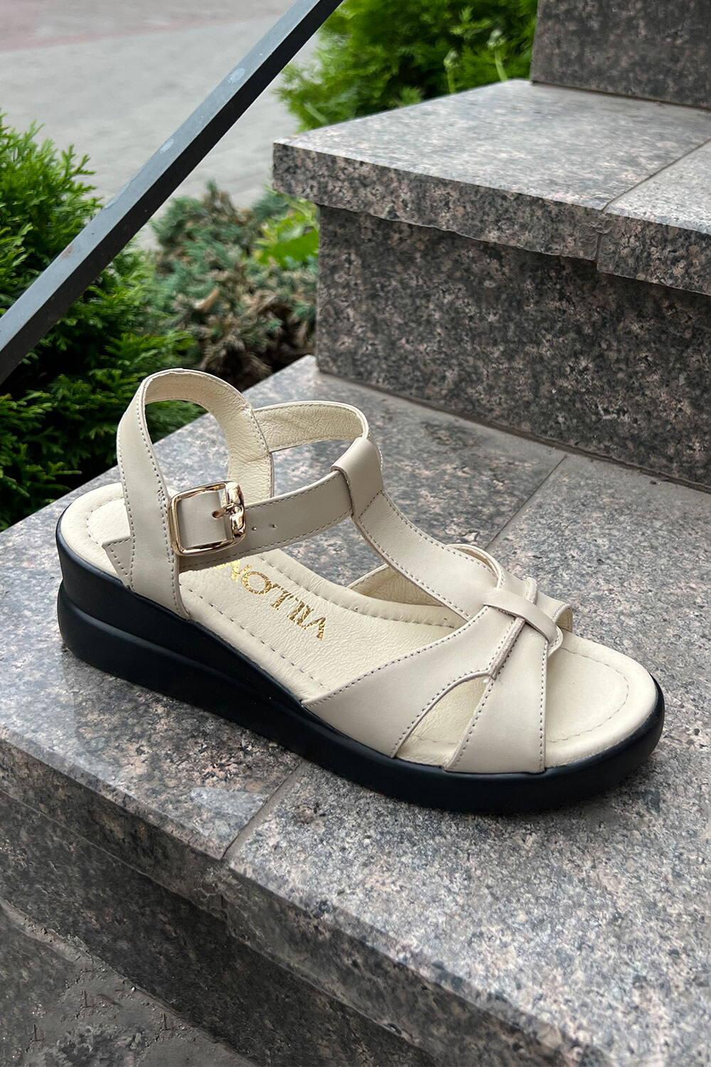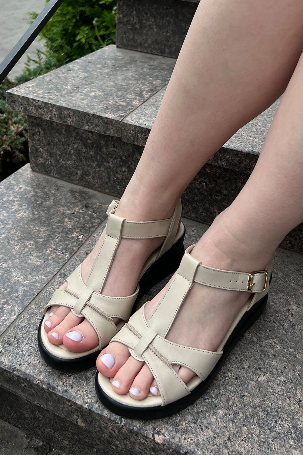 Жіночі босоніжки бежевого кольору на чорній танкетці 4206184