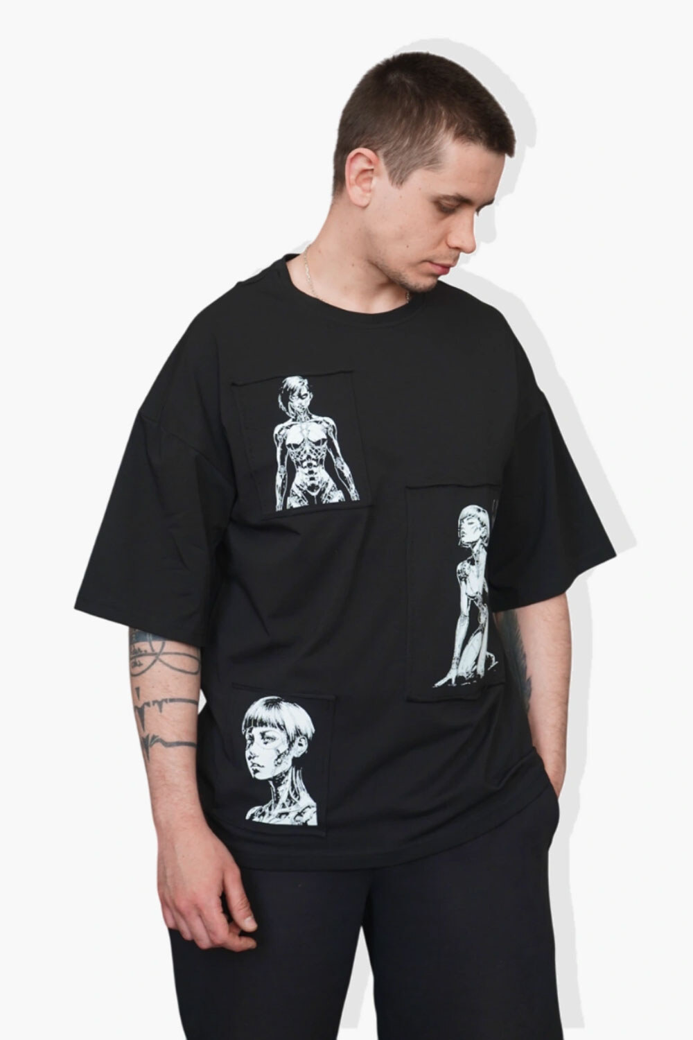 - Три окремі принти виконані на нашивках і закріплені на виробі — деталізація, що створює характер.