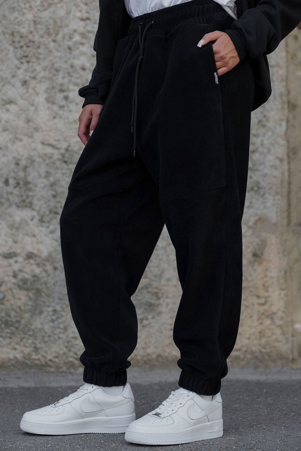 - Флісові спортивні штани мають прямий вільний крій та пояс зі шнурком для зручної фіксації.