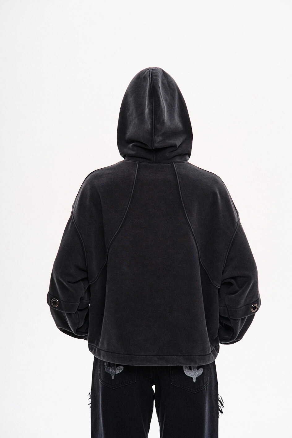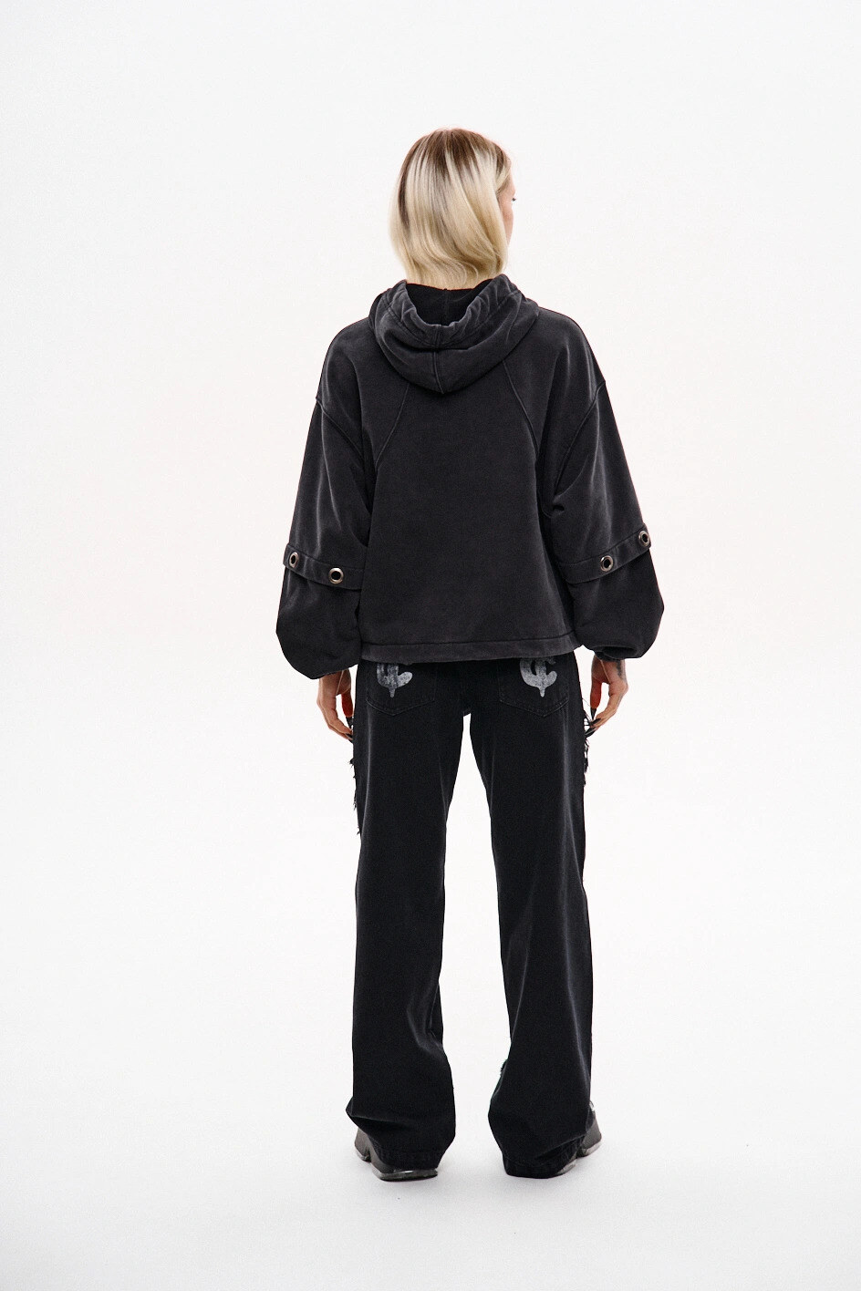 - Капюшон і рукави декоровані великими металевими люверсами, що додають характеру й обʼєму деталям.