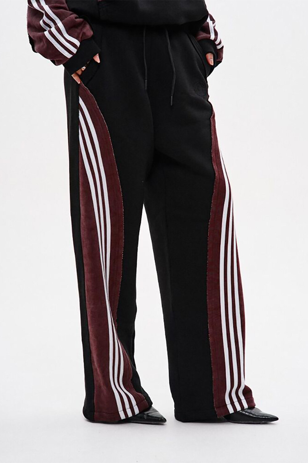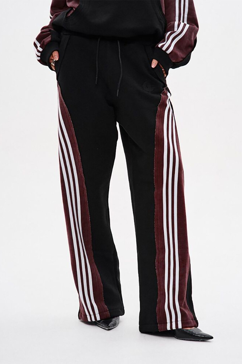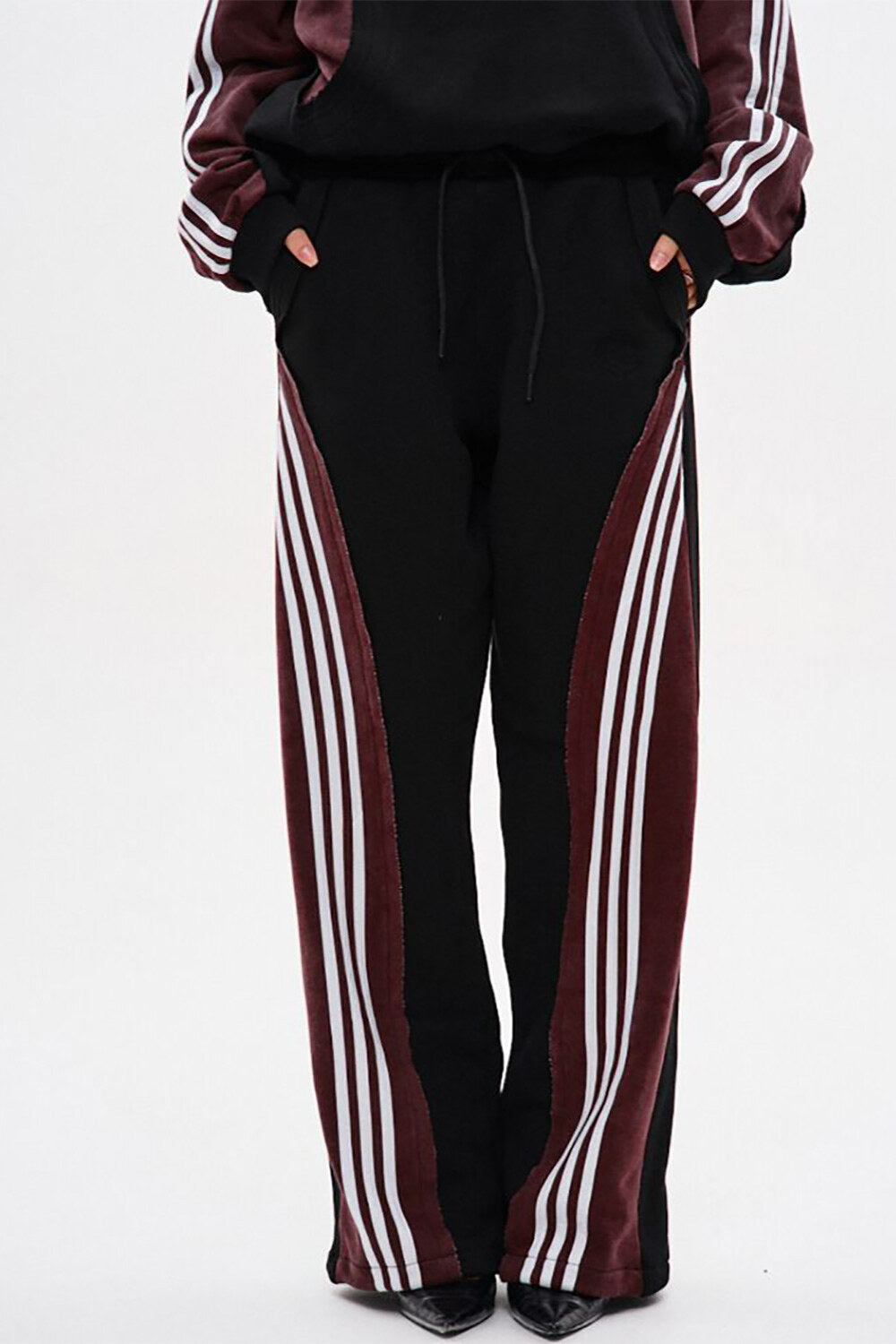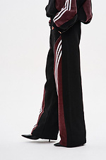 - Спортивні штани прямого крою з комбінації матеріалів у двох кольорах: основна частина — чорна, та кокетка ззаду — бордові з відкритими зрізами.