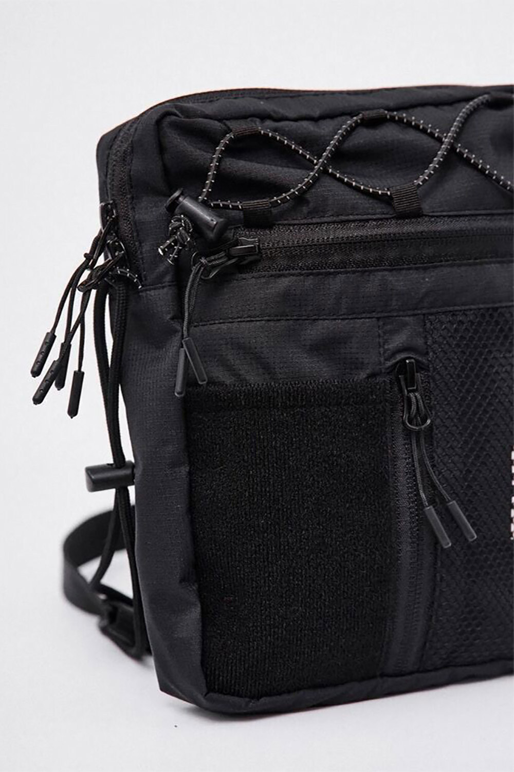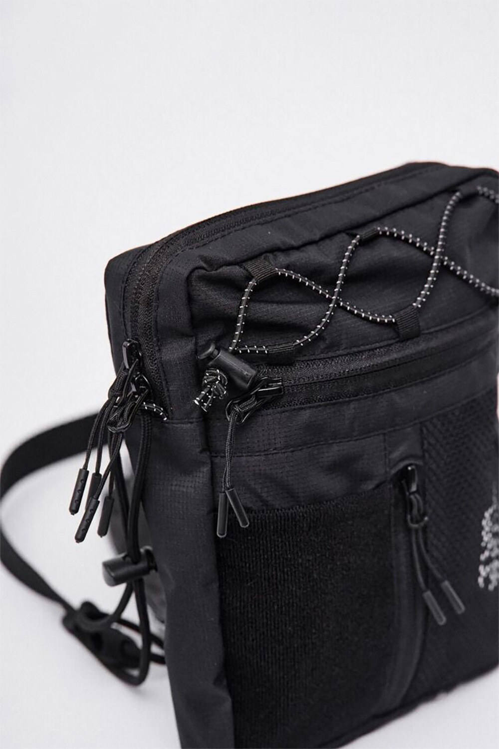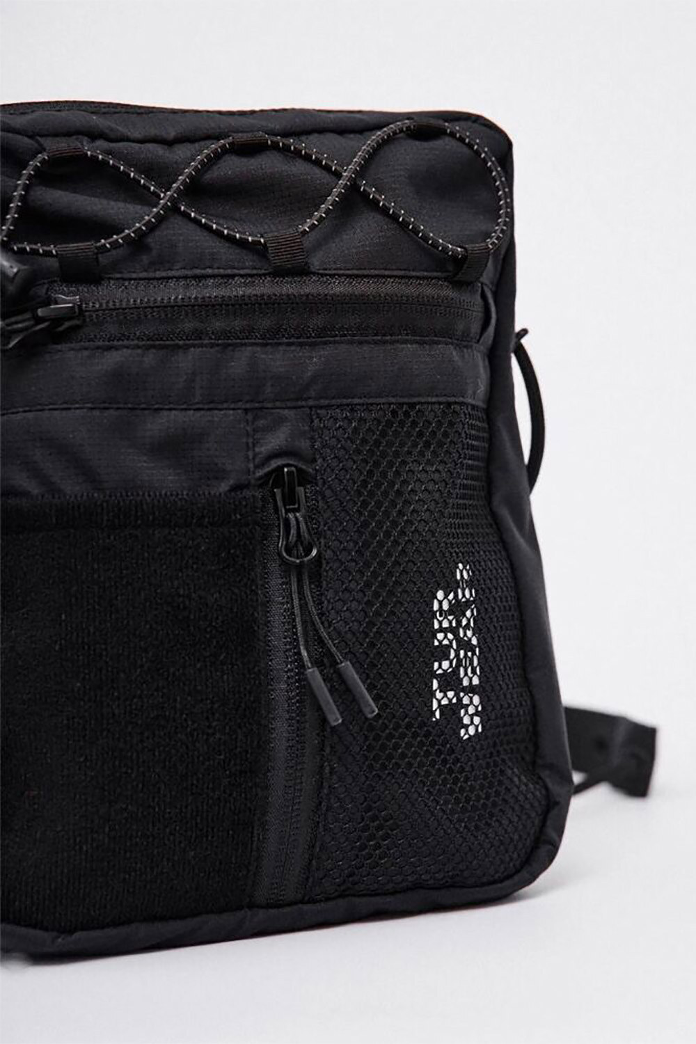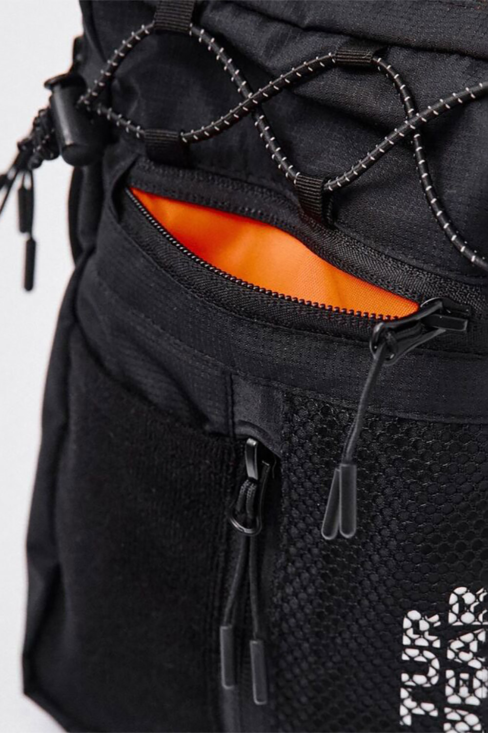 • Біля вертикальної кишені розміщена нашивка з велкро тканини, а поруч — деталь з сітки, під якою видніється фірмовий принт білого кольору.