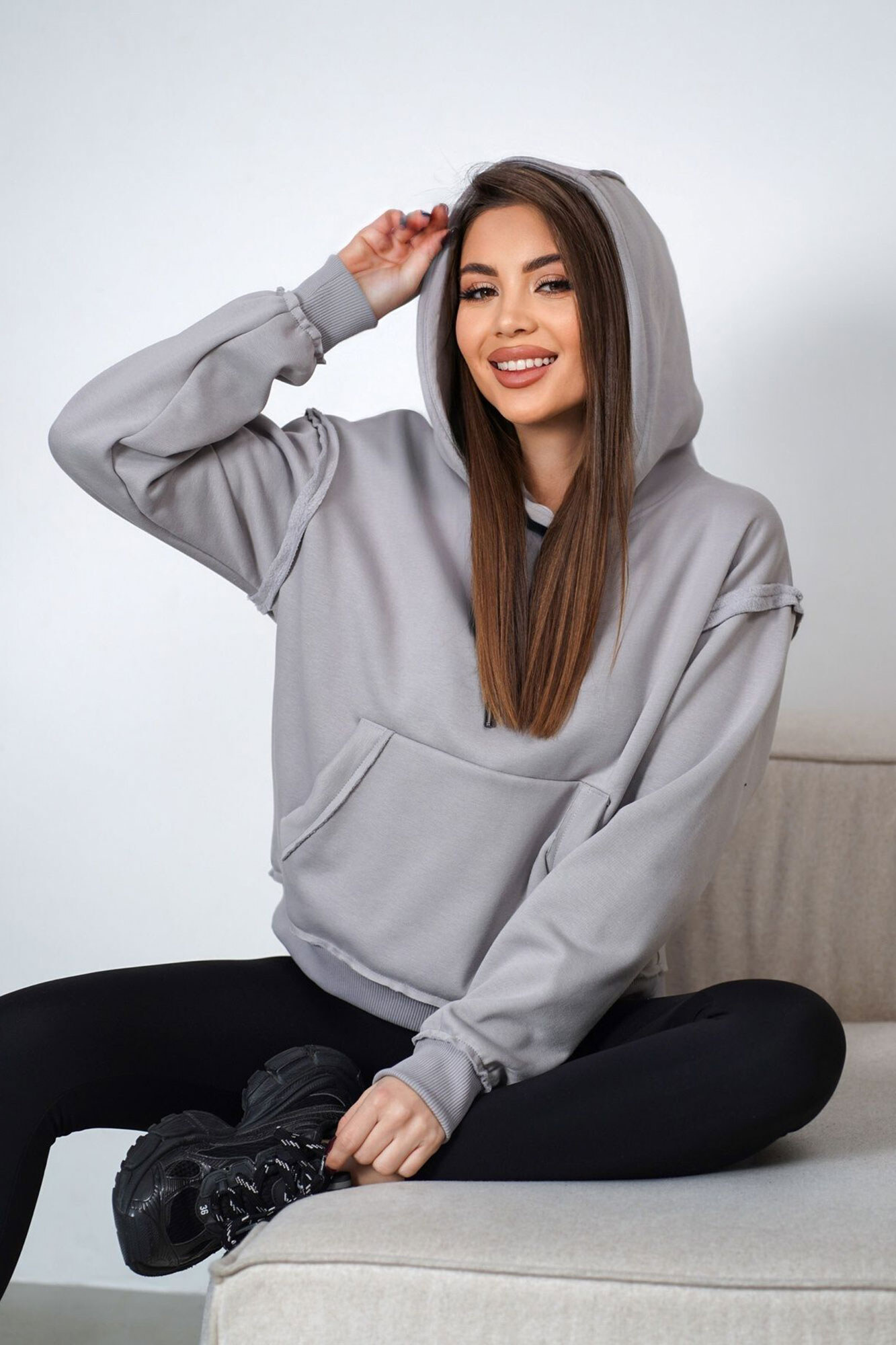 - Теплый женский худощавый на флисе большого размера в стиле оверсайз, с двойным капюшоном и спущенным плечевым швом.