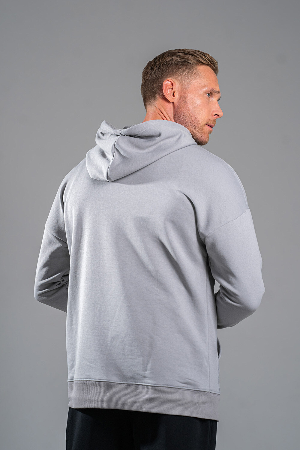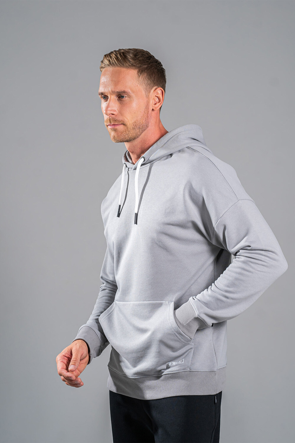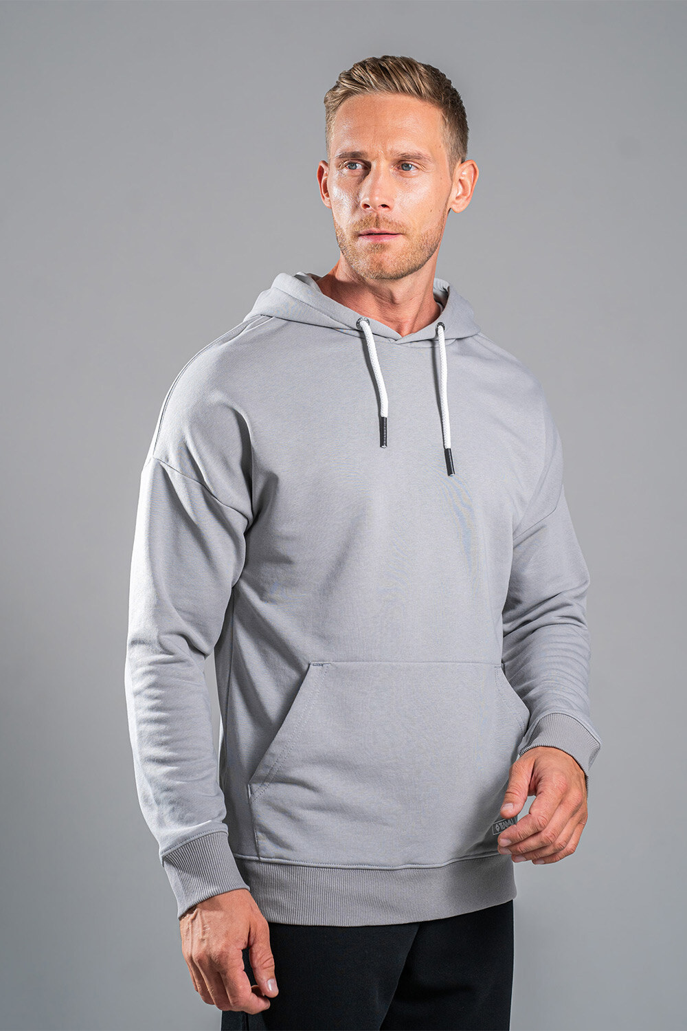 - Oversizowy krój z obniżonym szwem na ramionach, głębokim kapturem i kieszenią kangurką.