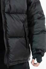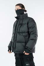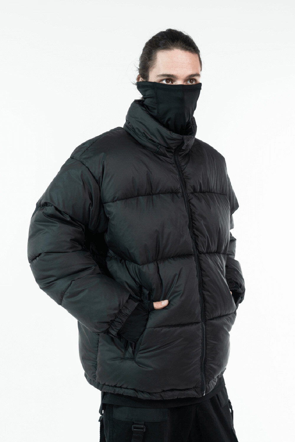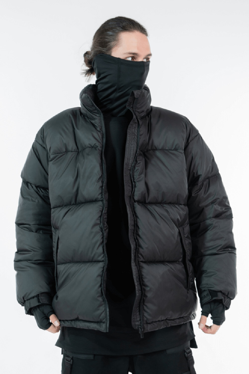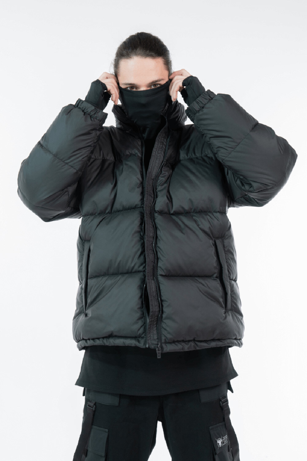 - Średniej długości obszerna kurtka puchowa z wysokim kołnierzem.