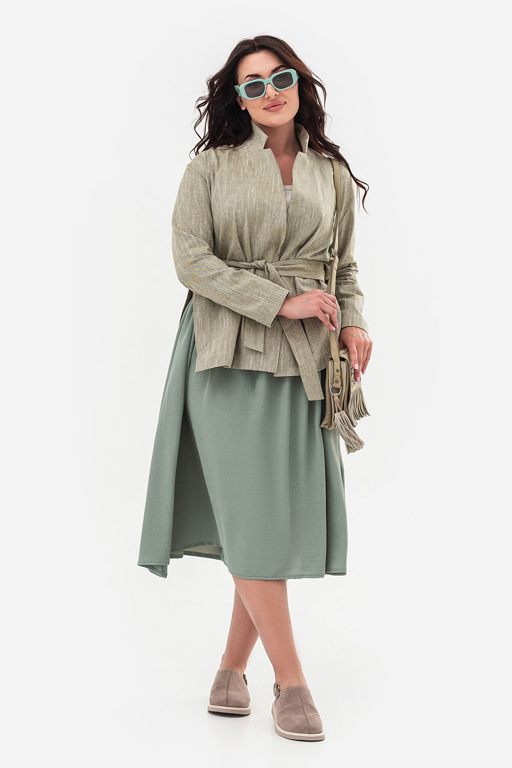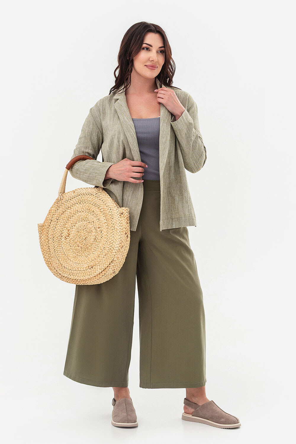 - Wykonany z tkaniny przypominającej len, ma przyjemną w dotyku fakturę, jest przewiewny, łatwy w noszeniu i dodaje stylizacji naturalnej elegancji.