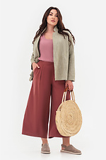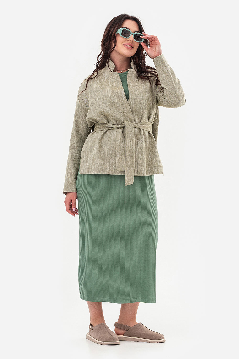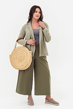 - Damska kurtka wykonana z lnianego materiału z bocznymi rozcięciami.