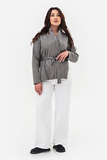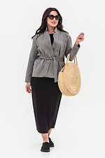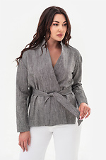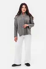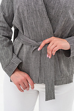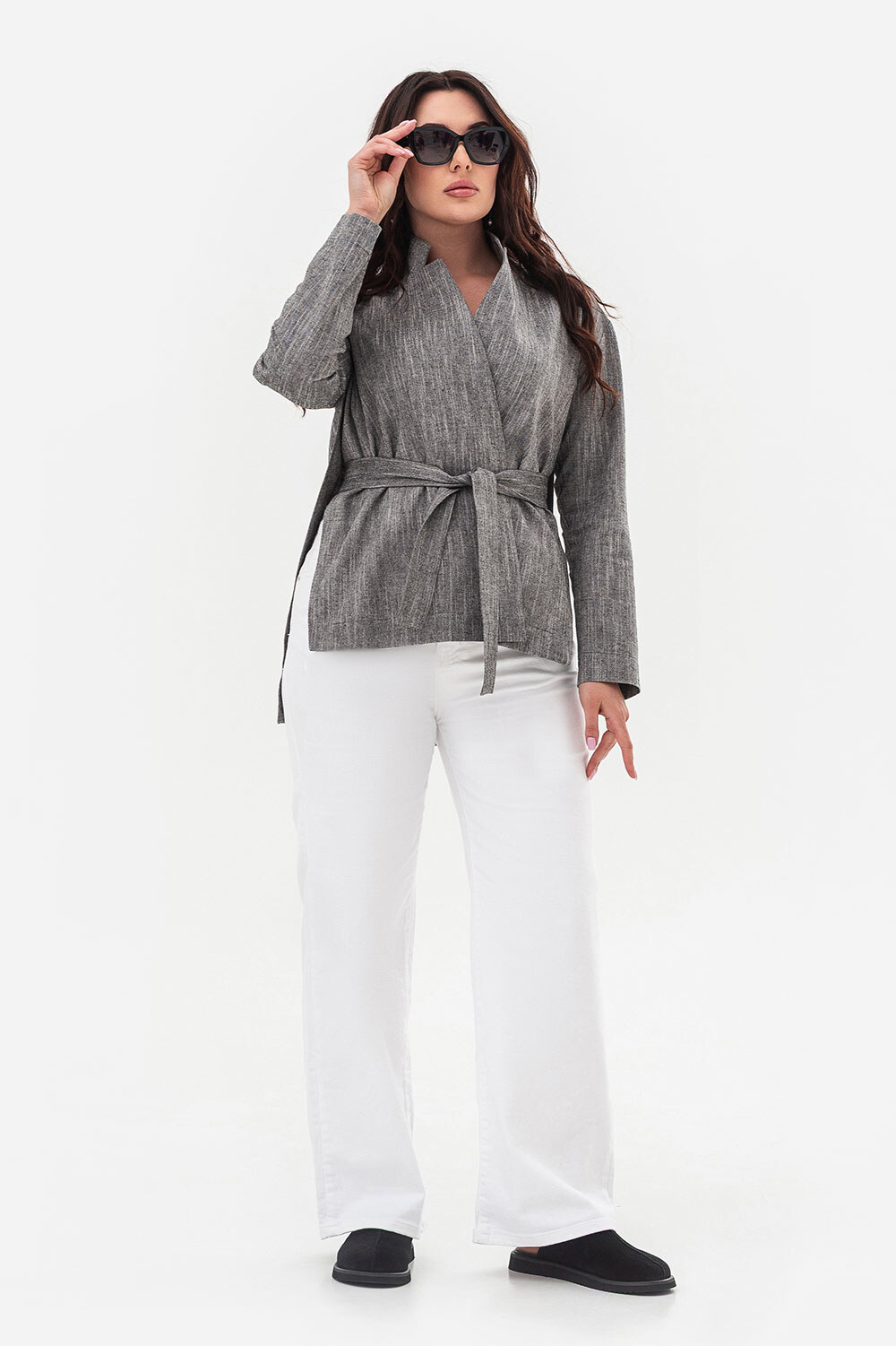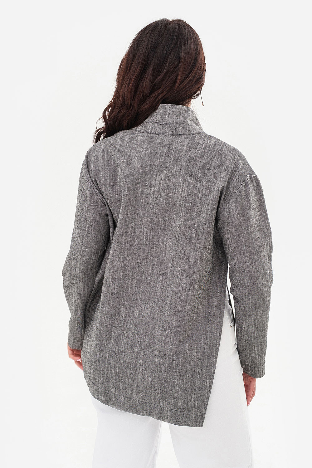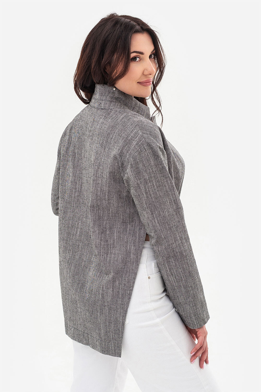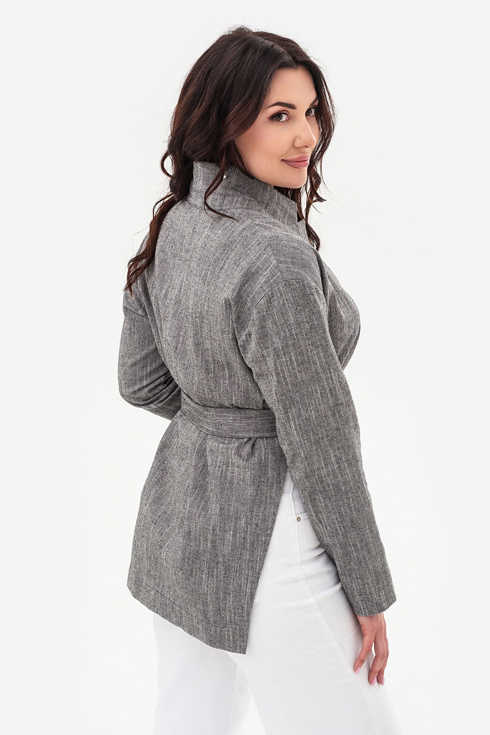 - Damska kurtka wykonana z lnianego materiału z bocznymi rozcięciami.