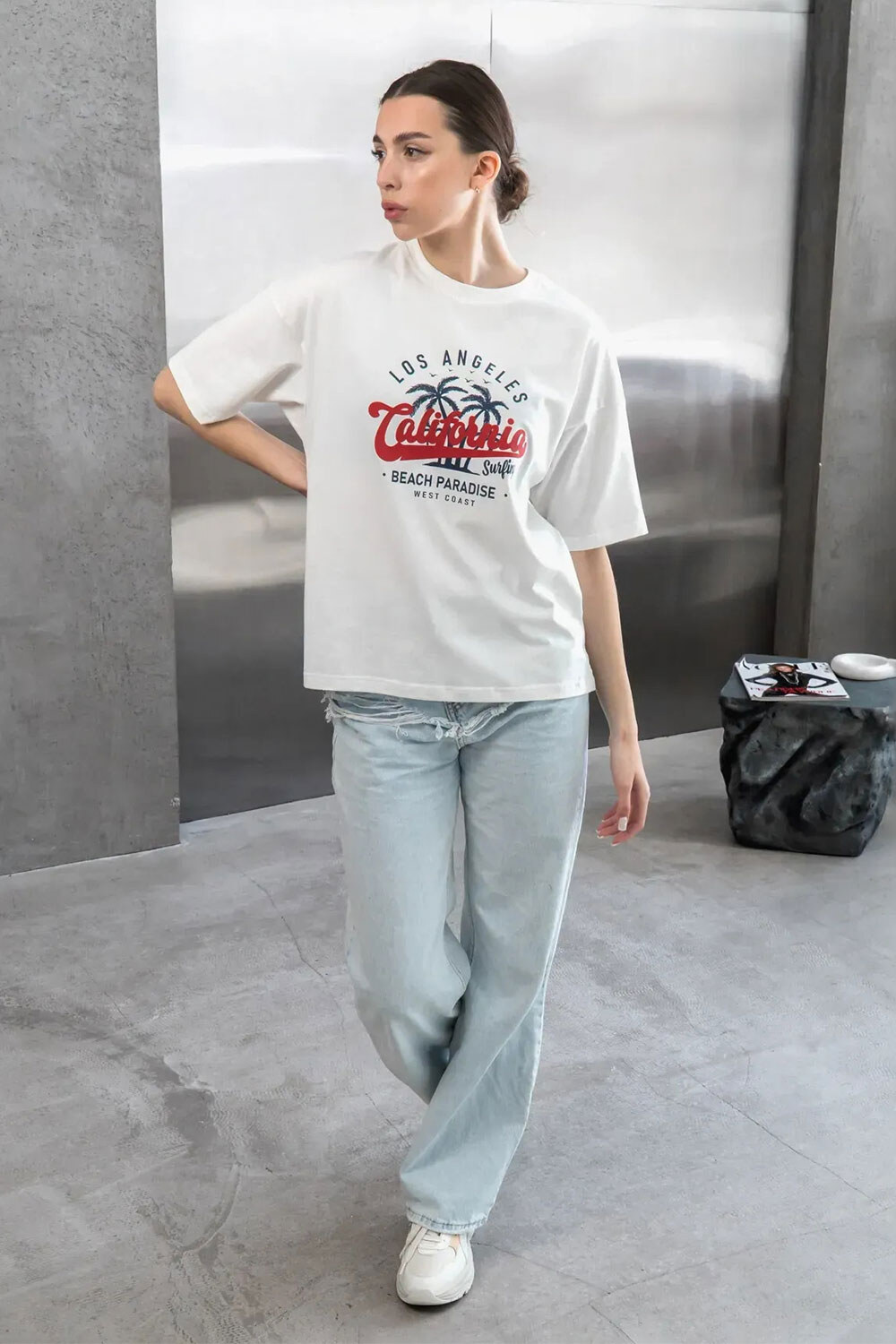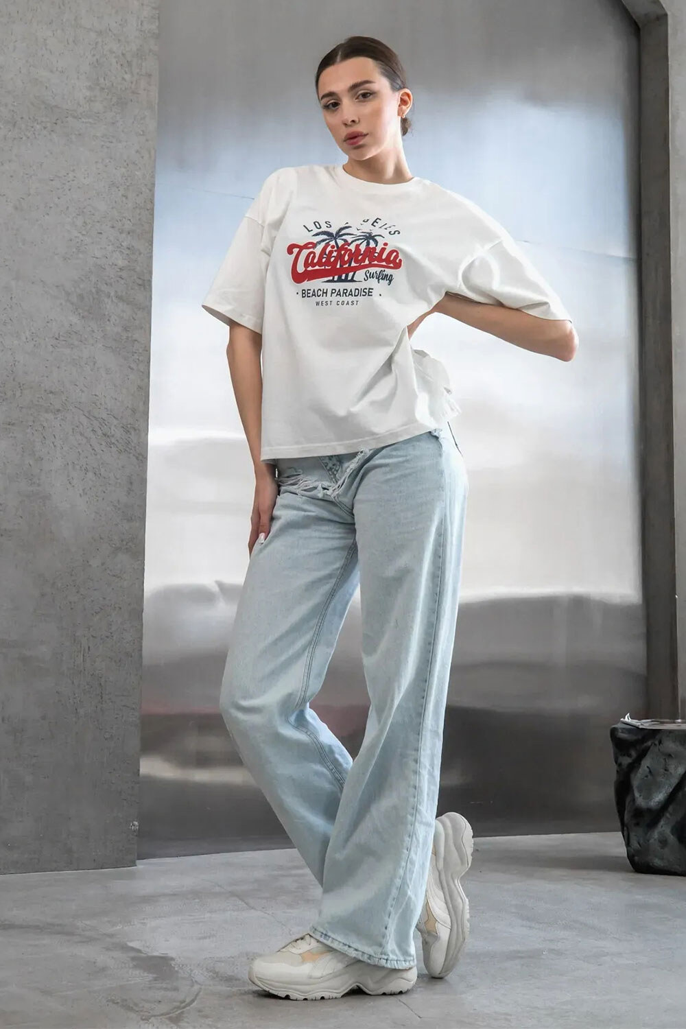 - T-shirt z nadrukiem można z łatwością łączyć z dowolnymi elementami garderoby - od jeansów po spódnice i szorty, dzięki czemu stanowi on uniwersalną bazę stroju.