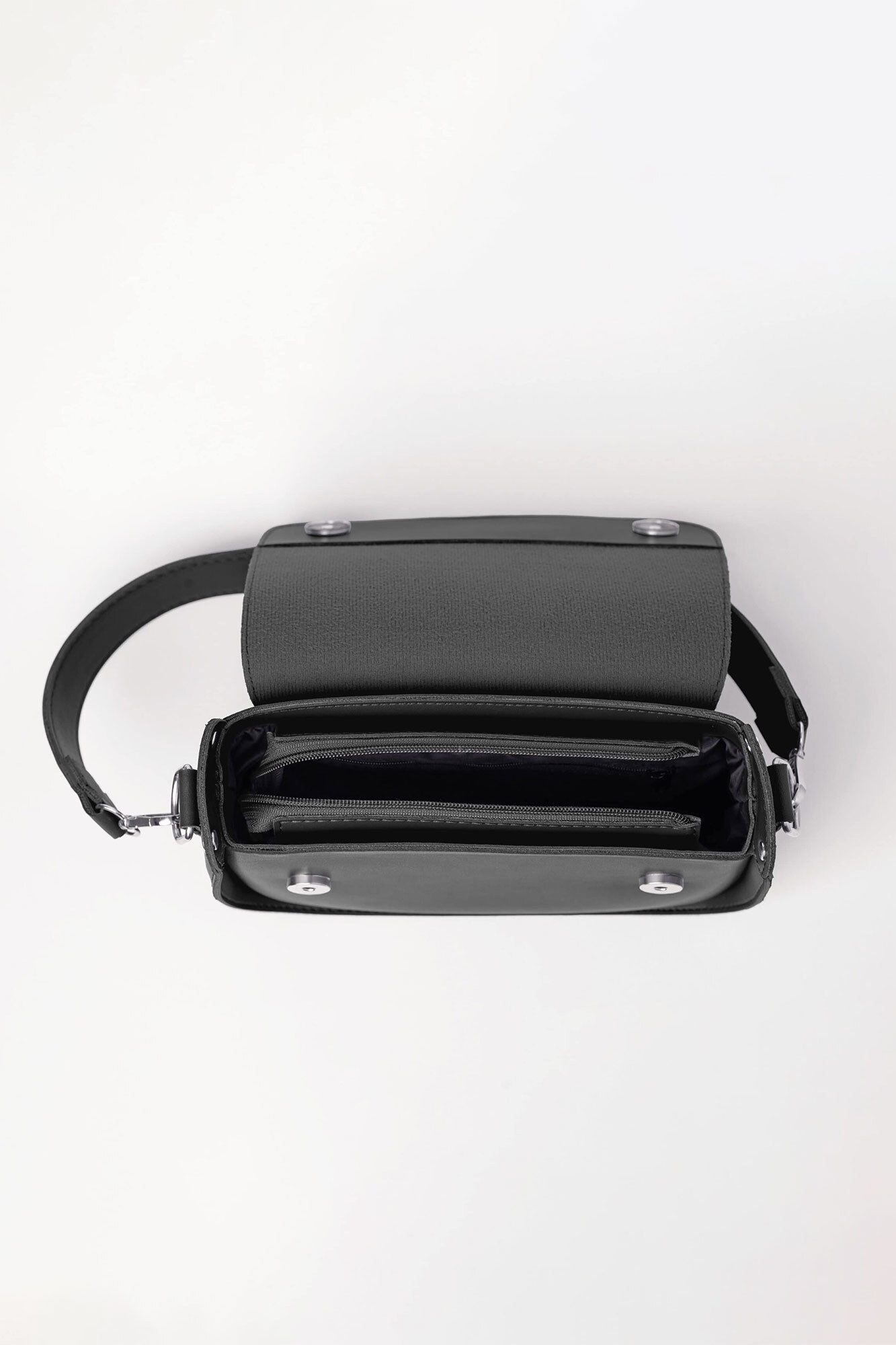 Verfügt über ein Hauptfach, verschlossen mit einer Klappe mit zwei Magnetknöpfen.