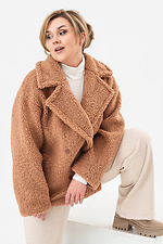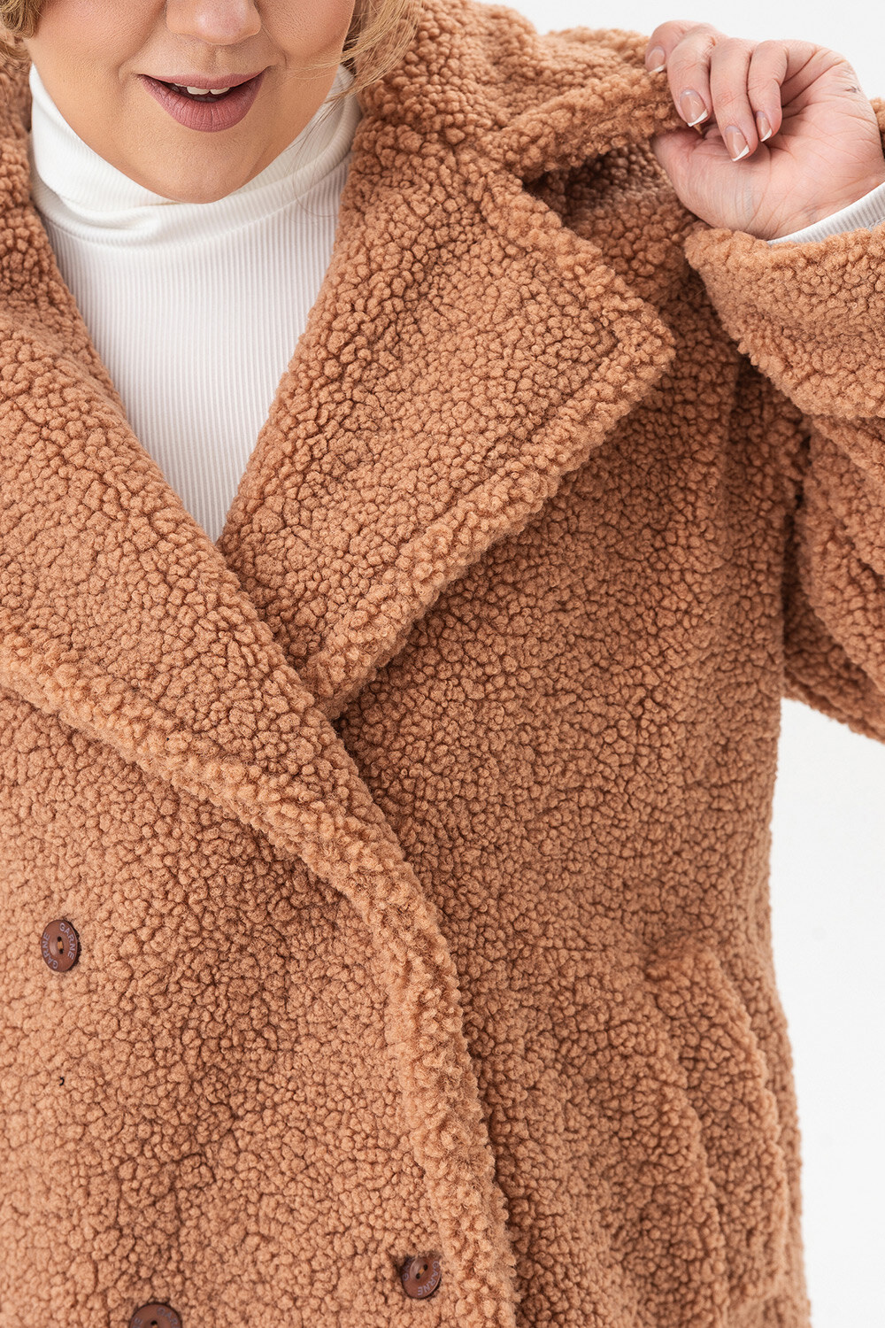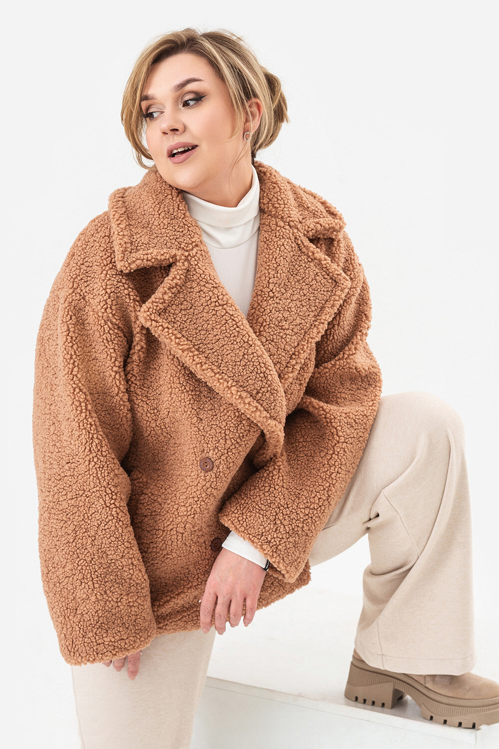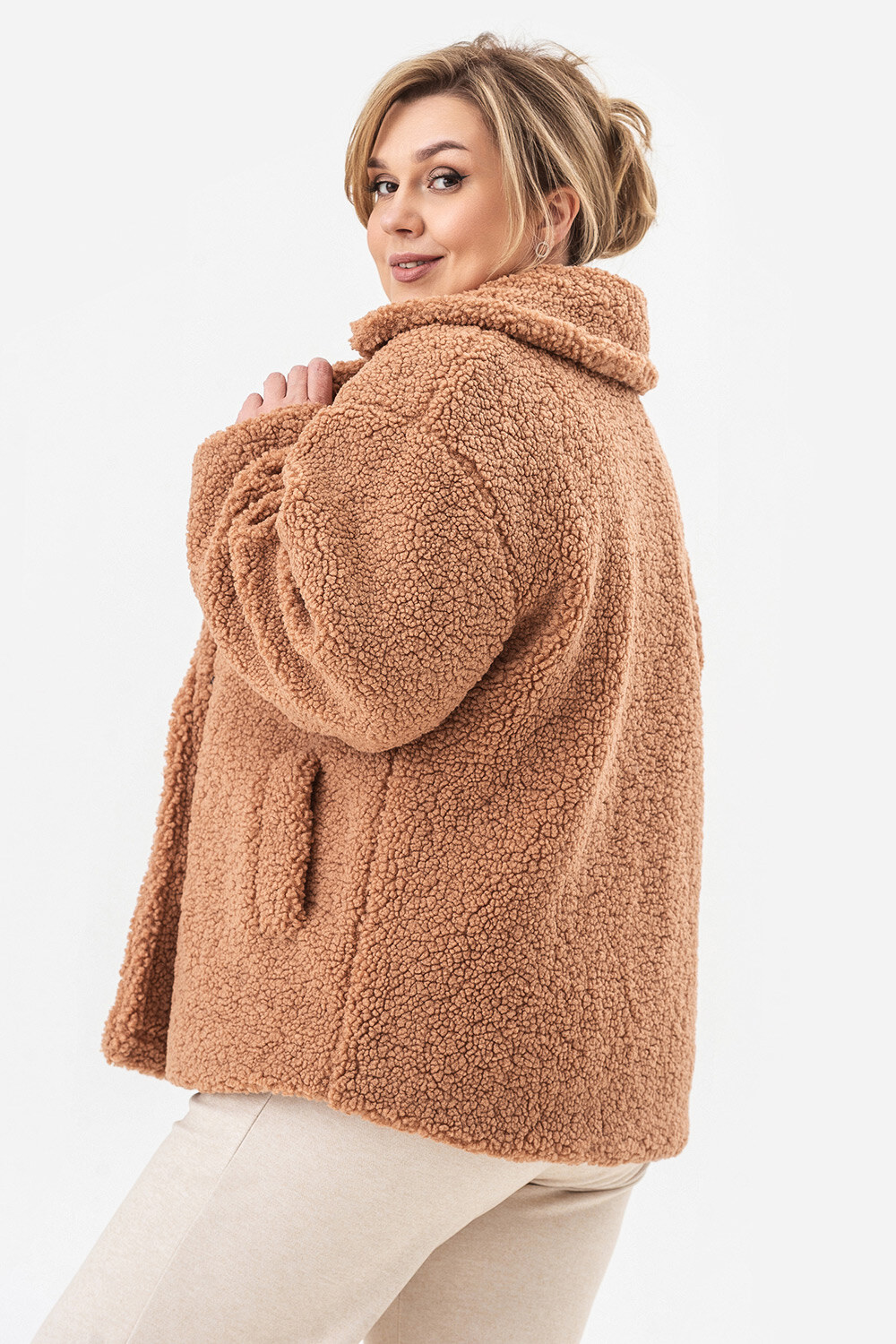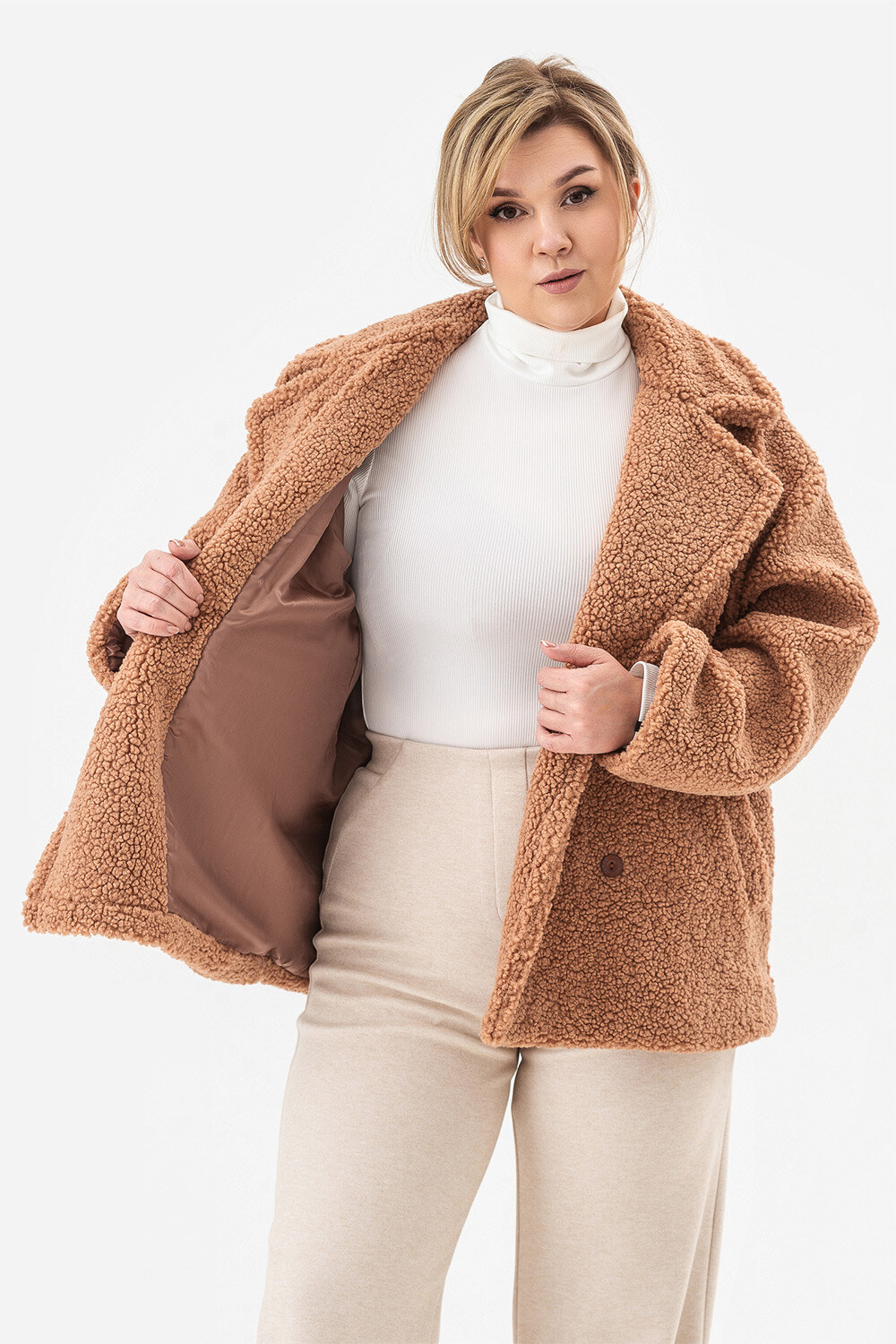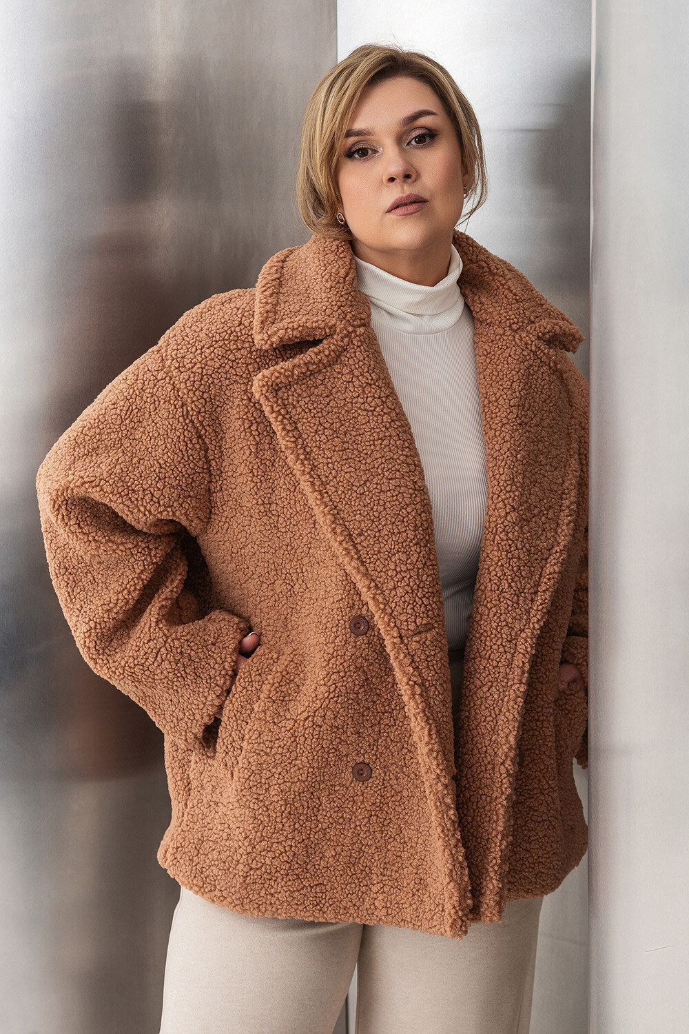 - Эта куртка из овчины на пуговицах создает стильный и уютный образ благодаря своей фактуре и объемности.