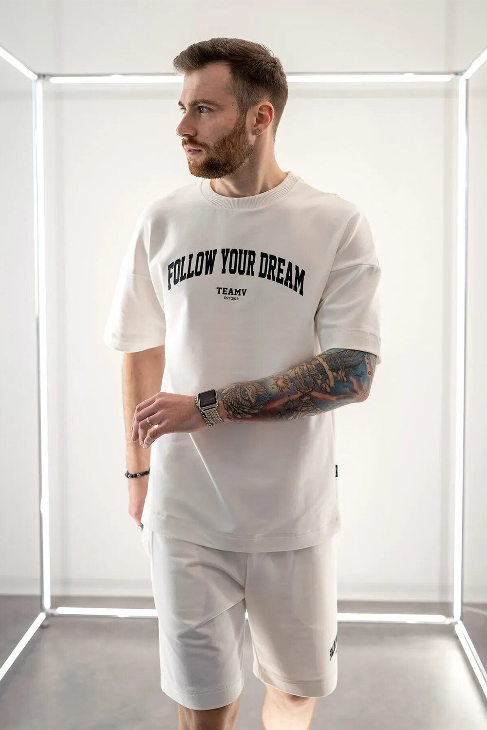 - Стильный однотонный мужской костюм на лето с брендированным принтом "FOLLOW YOUR DREAM".