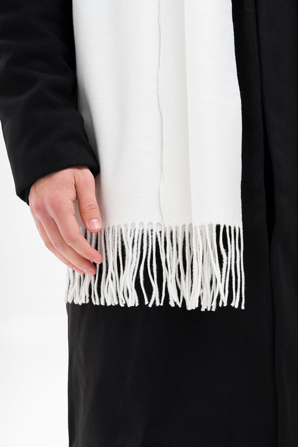 - Шарф с бахромой по краям прекрасно согревает и подходит как для повседневной носки, так и для более формальных событий.
