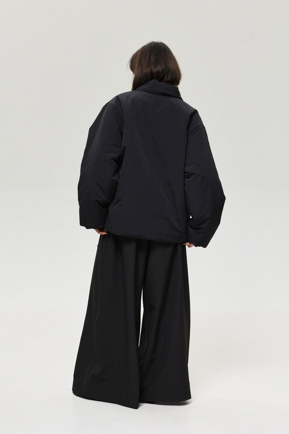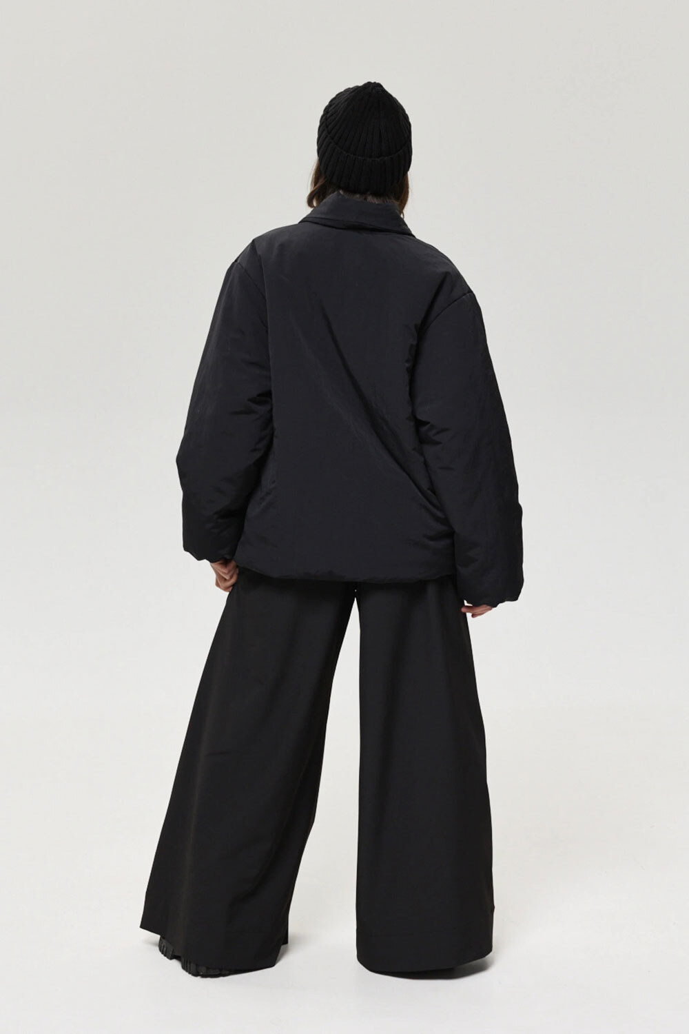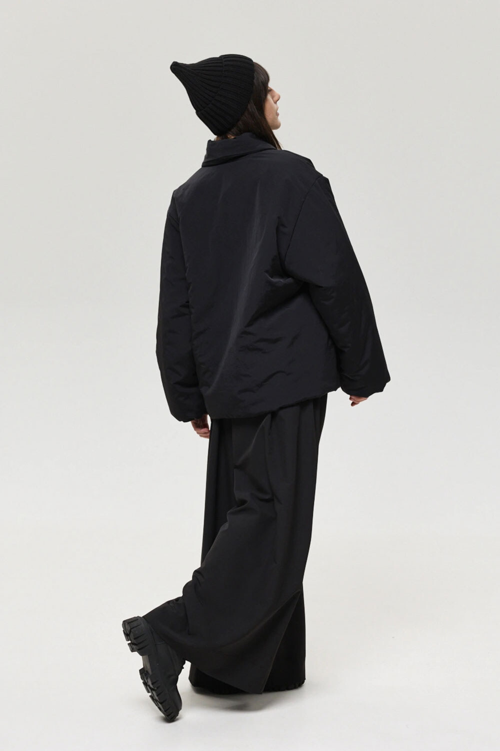 • Kurtka wykonana jest z teksturowanej tkaniny typu plaszczowego, która ma charakterystyczny wygląd z lekkim efektem „koszenia”, dodając stylu i objętości.
